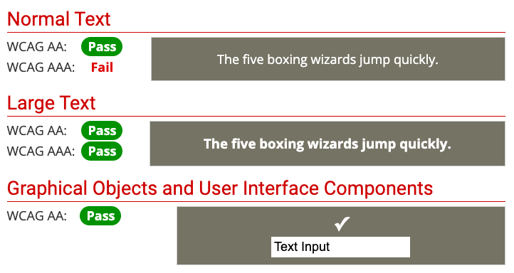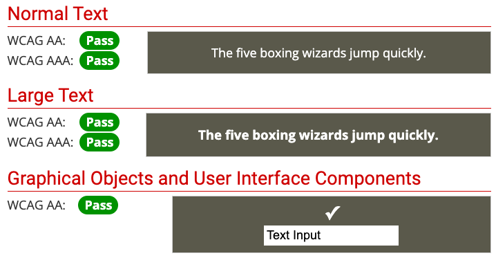 My original background color palette (Hex #757264) failed level AAA, so I darkened the background color until it was AAA compliant (Hex #5A584B).